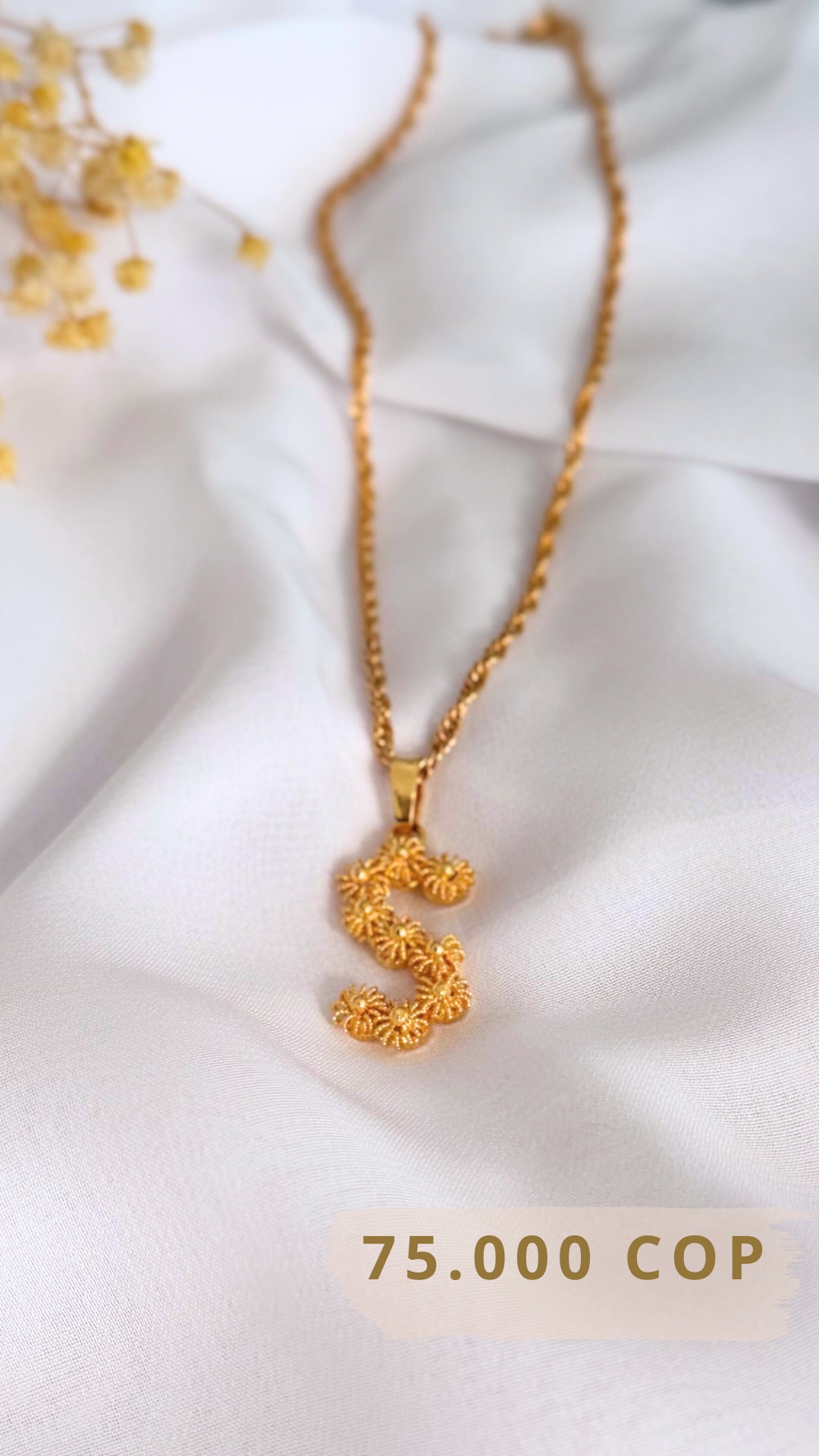 Elaborada artesanalmente en delicados hilos de bronce con baño en oro de 24kt, cada inicial está compuesta por pequeñas flores tejidas con la delicada técnica de filigrana, simbolizando amor, identidad y conexión.