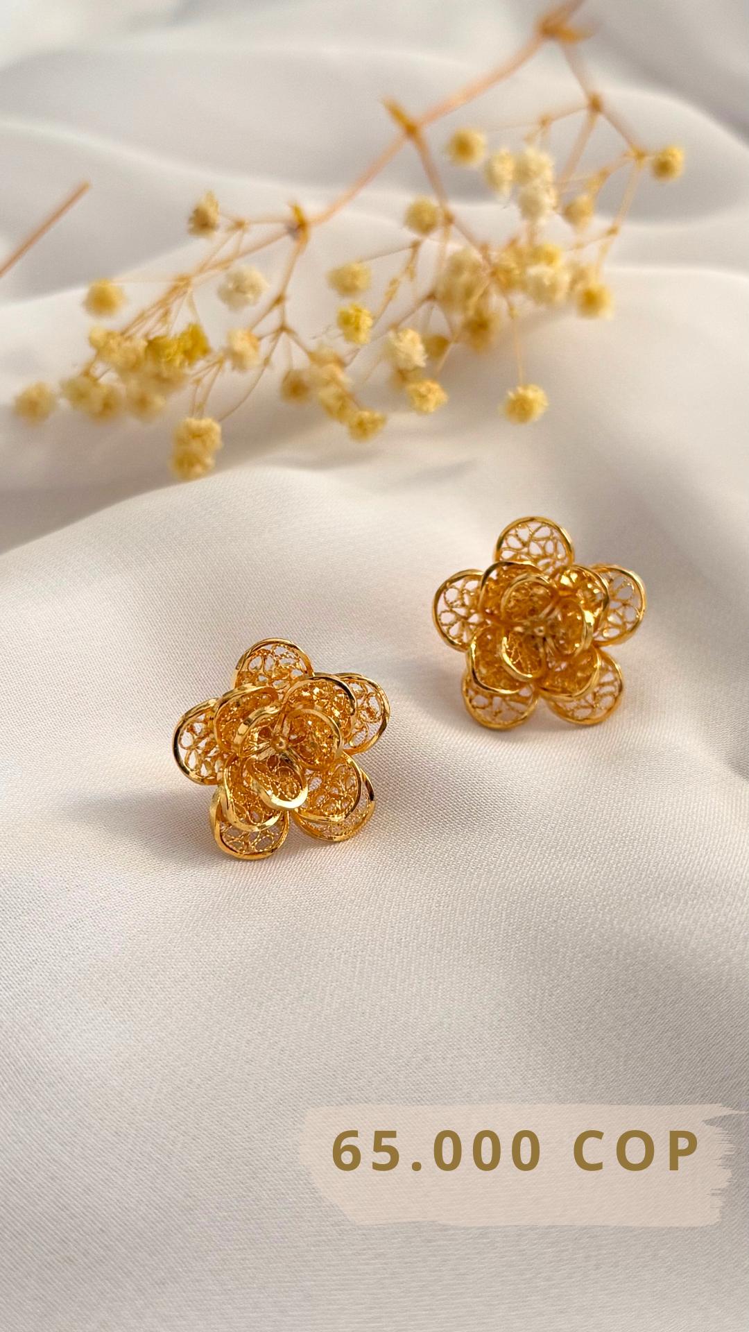 Aretes tipo botón ha sido elaborado artesanalmente en bronce con baño en oro de 24kt, utilizando la técnica tradicional de filigrana. Su diseño tridimensional evoca una rosa en plena floración, símbolo de amor eterno, belleza y sensibilidad.